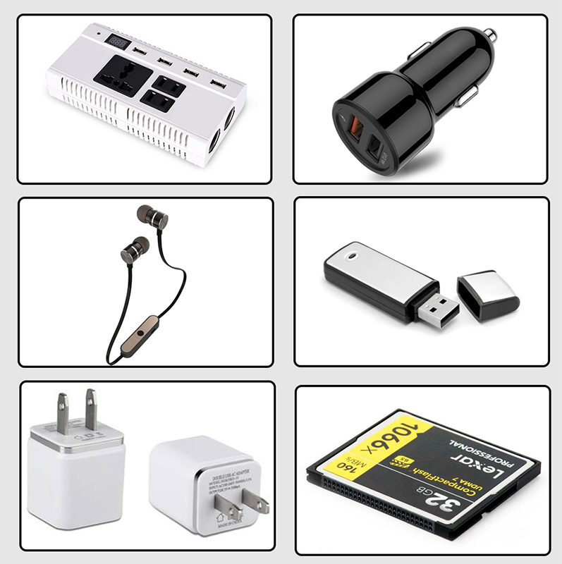 U盤,云U盤,USB插件,SD卡,CF卡,TF卡,電子煙,充電器(電源適配器),耳機插頭,耳塞網,藍牙耳機,感應卡(門禁卡),筆套,手表,智能手環,口服液瓶蓋,點滴瓶蓋,手機飾件,塑料名片夾,閥控式密封維護鉛酸蓄電池,電池殼,助聽器,超市防盜扣,超市硬標簽,醫用撥罐,輸液過濾器,鼻塞,呼吸,吸氧過濾器,醫療器械葉輪,血壓儀,血氧儀,過濾器,亞克力瓶蓋,組培瓶蓋,電器配件,商標,葉輪等.